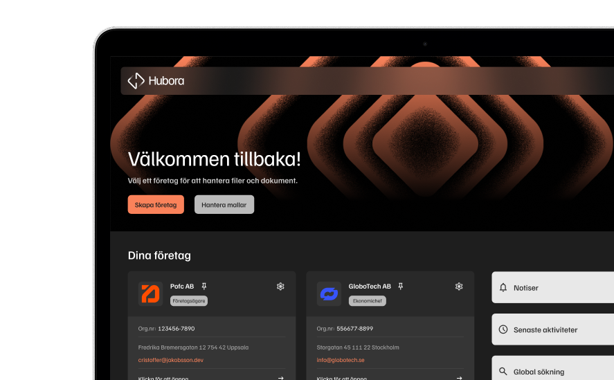 När filer delas via mejl, länkar och mappar försvinner snabbt överblicken. Hubora samlar dokument på ett ställe där struktur, versioner och behörigheter följer med – oavsett vem som arbetar med dem. Färdiga mallar för företagsdokument gör det enkelt att skapa korrekt underlag direkt.